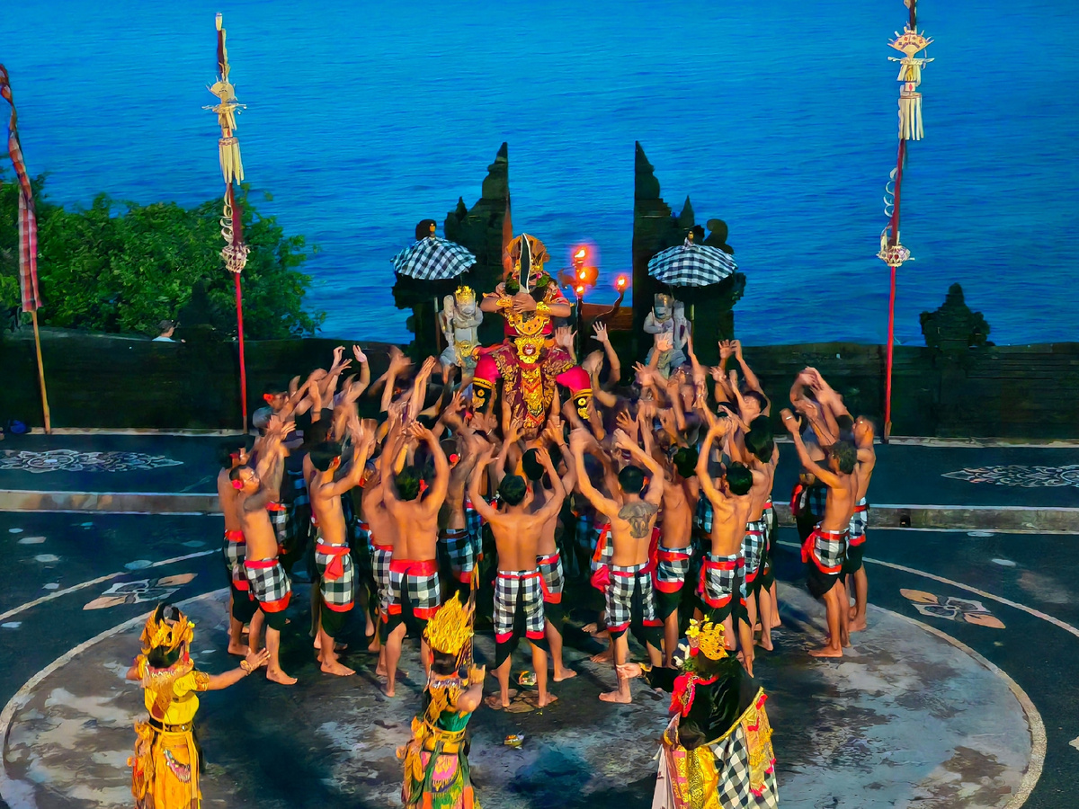 Танец Кечак (Kecak) - это самый уникальный танец без музыкальных инструментов, известный своим мужским хором (около 70 мужчин), который ритмично выкрикивает "чак-чак-чак" вместо музыкального сопровождения.