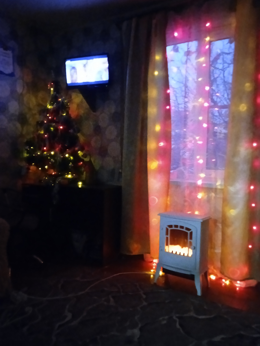В доме царит атмосфера праздника Рождества Христова. На окне развешаны гирлянды и мерцают свечи, создавая мягкий, уютный свет.