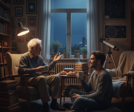 Дмитрий жил в многоэтажке и каждый день в лифте встречал молчаливого соседа, старого профессора астрономии Аркадия Петровича. Тот всегда смотрел в пол. Однажды Дмитрий, возвращаясь с работы поздно вечером, увидел, что дверь в квартиру профессора приоткрыта, а в квартире — темнота и тишина. Забеспокоившись, он постучал и зашёл. Аркадий Петрович сидел в кресле у окна, грустный. В этот день умерла его старая кошка, его единственная собеседница. Дмитрий, вместо того чтобы вежливо удалиться, сходил к себе, взял пару