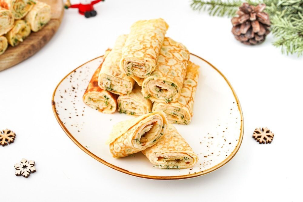 Эффектная, нежная и простая в приготовлении холодная закуска, которая всегда украшает стол. 📖 Ингредиенты: · Для яичных блинчиков: Яйца куриные — 5 шт., Сметана — 50 г. · Для начинки: Сыр твёрдый — 200 г, Майонез — 50 г, Чеснок — 3 зубчика, Укроп свежий — небольшой пучок (ок. 20 г). · Растительное масло — для жарки (1 ч.л.) 🧑🍳 Приготовление: 1. Яичные блинчики: Взбейте яйца, добавьте сметану и перемешайте до однородной, текучей массы. На хорошо разогретой сковороде смажьте кисточкой немного масла. Жарьте тонкие блинчики с двух сторон до готовности (по 1-2 минуты с каждой стороны). Сложите стопкой и дайте остыть. 2. Начинка: Сыр натрите на мелкой тёрке. Чеснок пропустите через пресс, укроп мелко порубите. В миске смешайте сыр, чеснок, укроп и майонез до однородной кремовой массы. 3. Сборка рулета: Каждый остывший блинчик равномерно намажьте тонким слоем сырной начинки, не доходя 1-2 см до краёв. Аккуратно и плотно сверните в рулет. 4. Настаивание: Готовые рулеты плотно заверните