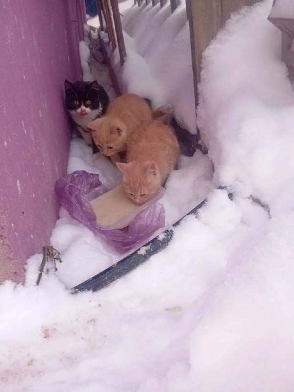 Этих котят кормилица обнаружила в садоводстве Колпино дня 4 назад, потом они пропали, вчера их снова увидели, перебежали в более теплое местечко.