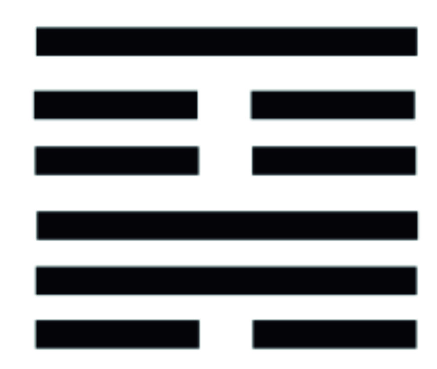 Как видите, верхняя триграмма — Гора, нижняя — Ветер, то есть Ветер располагается внизу Горы. Гора мешает и препятствует ему свободно