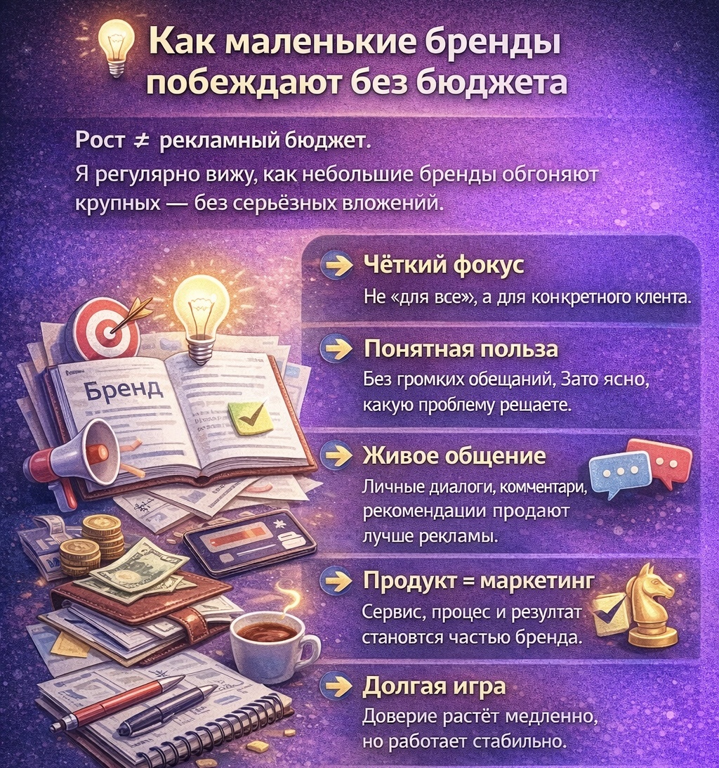 В маркетинге есть устойчивый миф: чтобы расти, нужен бюджет. Реклама, охваты, агентства, воронки — кажется, что без этого бизнес обречён оставаться «маленьким». Но на практике я всё чаще вижу обратное. Небольшие бренды без серьёзных вложений не просто выживают — они выигрывают у более крупных игроков. Не за счёт хитростей. А за счёт подхода. Они не пытаются нравиться всем Крупные компании часто вынуждены быть универсальными. Малый бизнес может позволить себе роскошь — быть точным. Маленькие бренды: • чётко понимают, кому продают; • говорят на языке своей аудитории; • не распыляются на лишние сегменты. Когда клиент чувствует, что с ним говорят «его словами», цена и масштаб отходят на второй план. Они делают ставку на смысл, а не на охваты Без бюджета не получится «перекричать рынок». Зато можно быть понятнее. Малые бренды выигрывают, когда: • ясно объясняют, какую проблему решают; • показывают, как устроен процесс; • честно говорят о плюсах и ограничениях. Так формируется доверие — самы