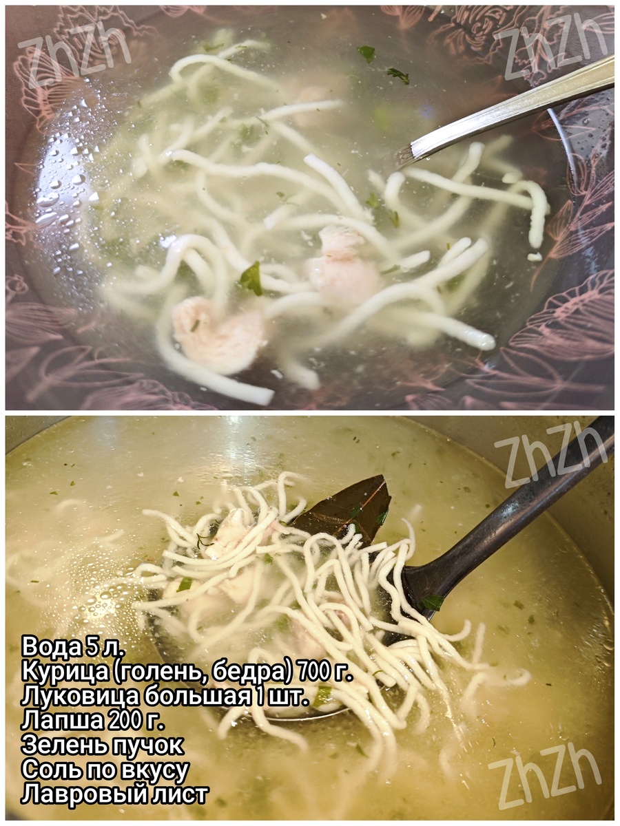 По готовности, луковицу вытащить, она больше не нужна (хотя при желании можно измельчить и добавить в суп). Когда курица остынет, мясо отделить от костей, порезать кусочками и отправить обратно в бульон. Добавить лавровый лист, соль и мелко нарезанную зелень. Когда все закипит, добавить лапшу, перемешать. Проварить все около 10 минут. Суп готов.