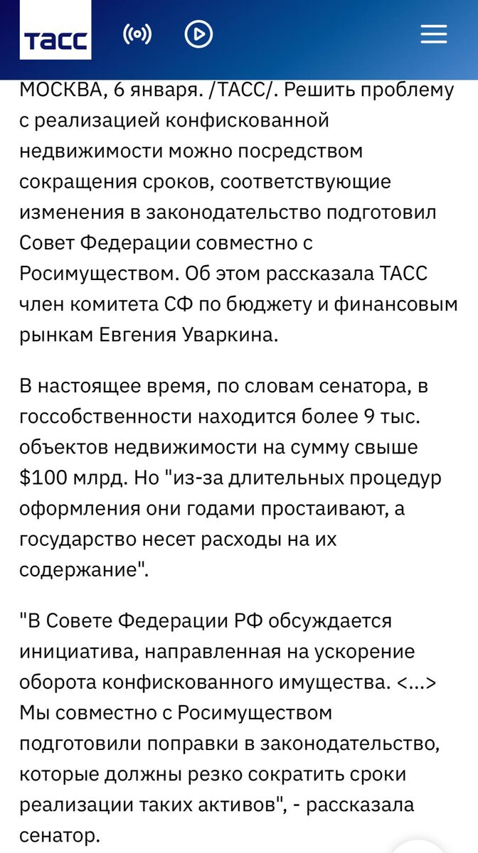 Это общая оценка, не только жилье, а коммерческие помещения, участки, производственные комплексы и так далее. Потому что легкая арифметика показывает нам среднюю цену объекта в 11 млн.долл., так то не однушки в райцентре. 100 млрд. долл. фантастически большая сумма, это оценочная стоимость, которая чаще падает во время аукционов, а не растет, но все равно порядок цифр поражает. Мой скромный опыт взаимодействия с Росимуществом в торгах, говорит о том, что это одно из самых коррупционноемких ведомств страны. Как говорит наш подписчик, если торги назначены, то в них уже кто-то выиграл. Поэтому предлагаю сенатору решить вопрос реализации с помощью антикоррупционных мер в ведомстве, а не перекраиванием нормативки, которую коррупционеры не соблюдают.