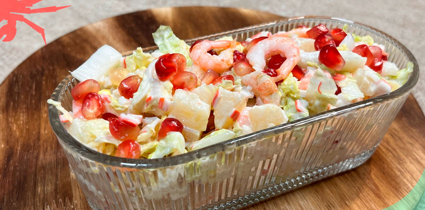 Ингредиенты: Для начала очищаем креветки. Затем мелко нарезаем крабовое мясо. Пекинскую капусту нарезаем небольшими кубиками или полосками. Далее нарезаем консервированные ананасы небольшими кубиками. Кладем