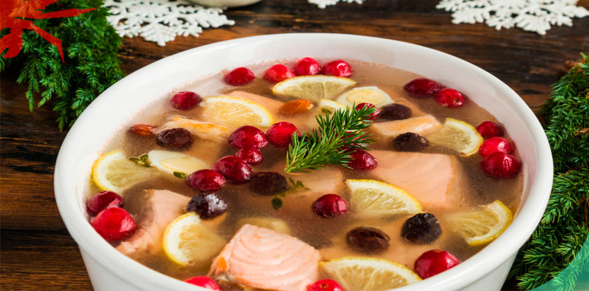 бульоне. В форму выкладываем рыбное филе, яйца и лимон, клюкву, изюм и
