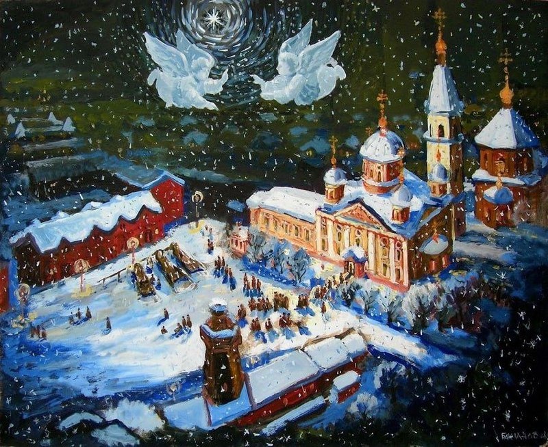 Рождество...Чудится в этом слове крепкий, морозный воздух, льдистая чистота и снежность. Самое слово это видится мне голубоватым. Даже в церковной песне: Христос рождается - славите! Христос с небес - срящите! Слышится хруст морозный. Синеватый рассвет белеет. Снежное кружево деревьев легко, как воздух. Плавает гул церковный, и в этом морозном гуле шаром всплывает солнце. Пламенное оно, густое, больше обыкновенного: солнце на Рождество. Выплывает огнем за садом. Сад - в глубоком снегу, светлеет, голубеет. Вот, побежало по верхушкам; иней зарозовел; розово зачернелись галочки, проснулись; брызнуло розоватой пылью, березы позлатились, и огненно-золотые пятна пали на белый снег. Вот оно, утро Праздника, - Рождество. В детстве таким явилось - и осталось. 📖 Иван Шмелев, "Лето Господне". Евгений Бакланов,«Над Троицким собором».