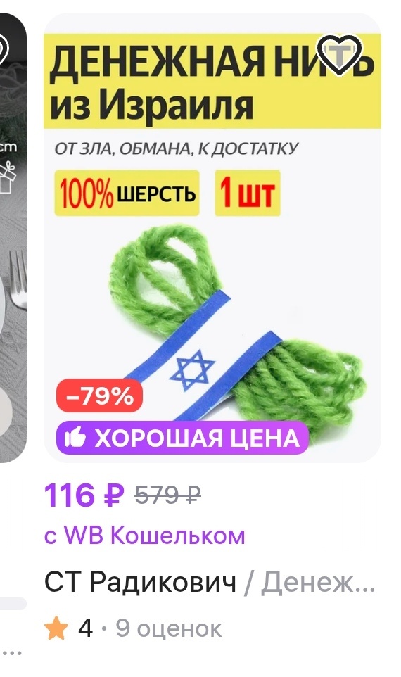 Решила я прикинуть цену бизнесу и округлила стоимость первого попавшегося на глаза мотка до 300 рублей. На "денежную" нить, а так же на нить от болей и вообще всех болезней пусть идет 50 см, тогда ее стоимость будет 60 копеек. Стоимость же "денежной" нитки видите сами. Бизнес практически со 100% прибылью, я как посчитала, сразу поняла, что денежная нить из Иерусалима и ниоткуда больше. И от болей тоже.