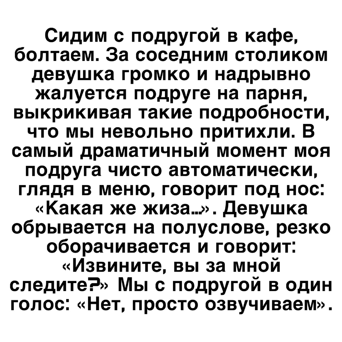 Сидим с подругой в кафе, болтаем. За соседним столиком девушка громко и надрывно жалуется подруге на парня, выкрикивая такие подробности, что мы невольно притихли. В самый драматичный момент моя подруга чисто автоматически, глядя в меню, говорит под нос: «Какая же жиза…». Девушка обрывается на полуслове, резко оборачивается и говорит: «Извините, вы за мной следите?» Мы с подругой в один голос: «Нет, просто озвучиваем».
