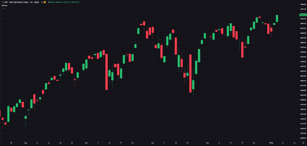 Пока что фондовый рынок в этом году пребывает в очень неплохом настроении. S&P 500 вырос в первые 3 торговых дня нового года, и вчера он установил новый исторический максимум закрытия на отметке 6945,82. До вторника последний рекорд закрытия был установлен в канун Рождества.