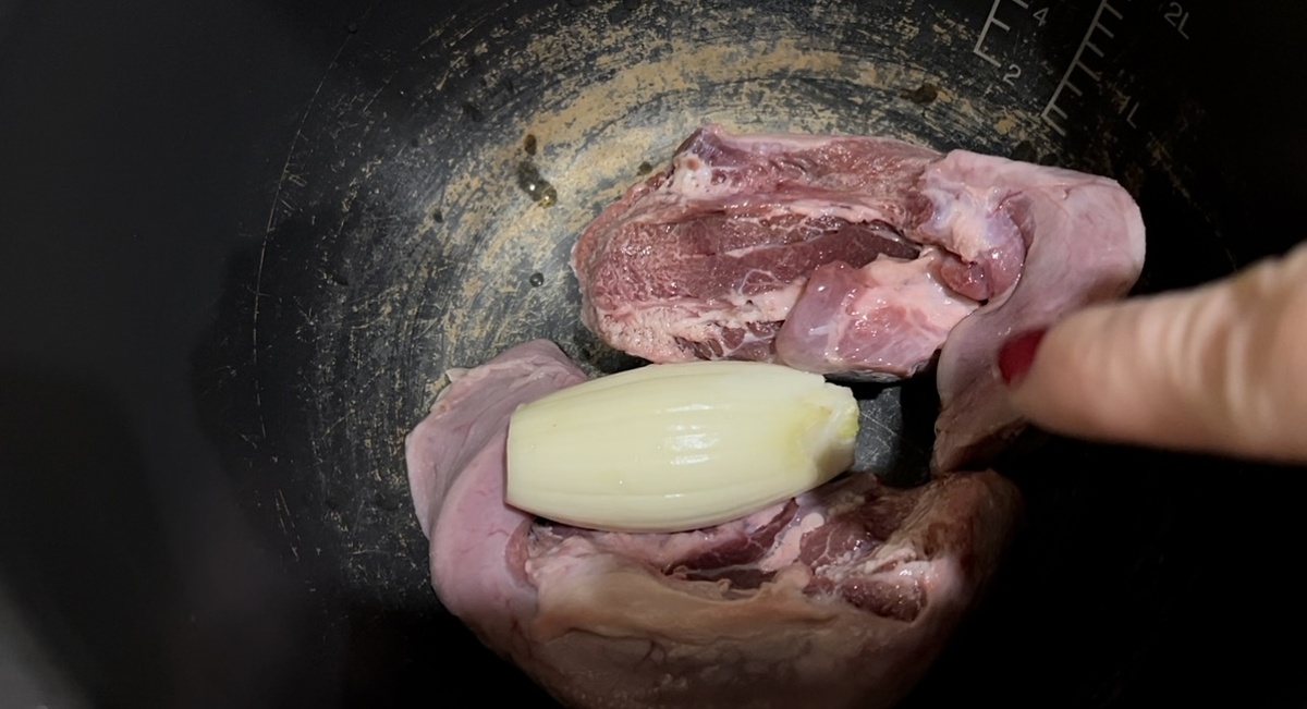 В чашу мультиварки отправляю 2 языка, нам достаточно. Чаша у меня уже очень старенькая. К языку добавляю луковицу, 5 шт душистого горошка и черного горошка, лавровый листик. Заливаю водой и ставлю на программу Мультиповар 120 градусов на 30 мин.