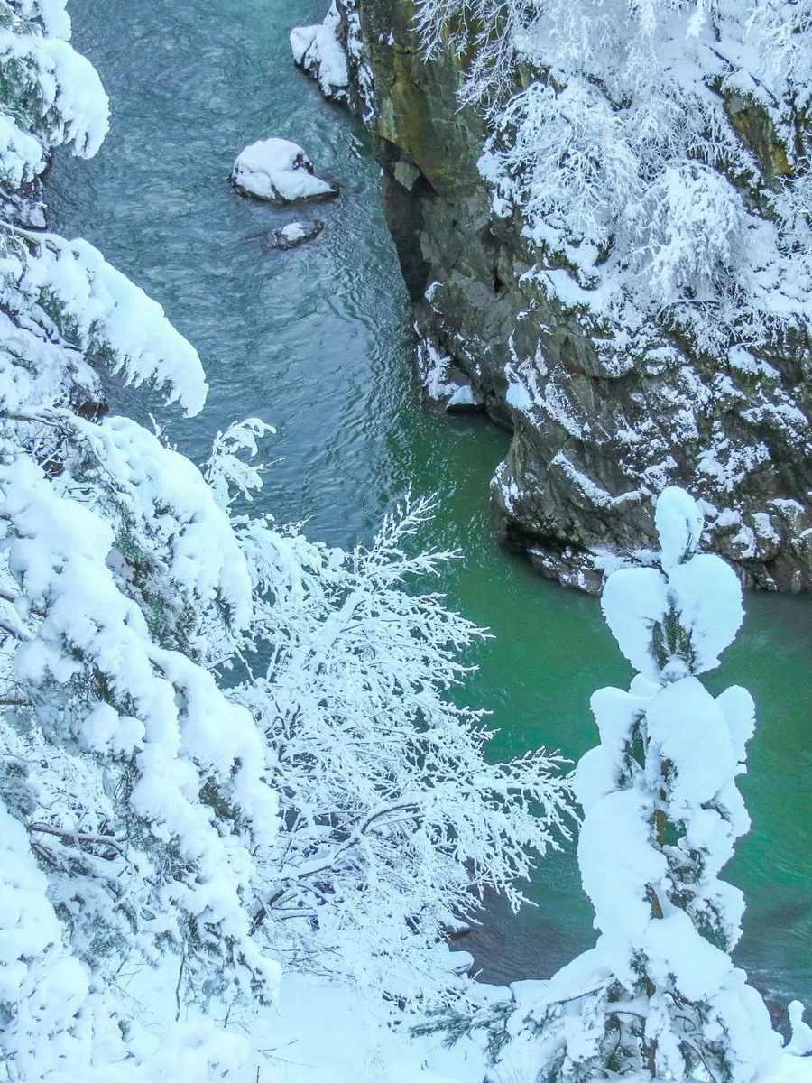 Новогодние каникулы порадовали снежными красотками. Замело горы и предгорья, посёлки и города, леса и долины 🌨️ На фото – заснеженный Гранитный каньон реки Белой и автодорога Майкоп - Гузерипль. 🪨 Гранитный каньон - отвесные гранитные скалы и горные склоны в пушистых сугробах. 📷 newnalchik ⛏ Юг Край Мы в МАХ