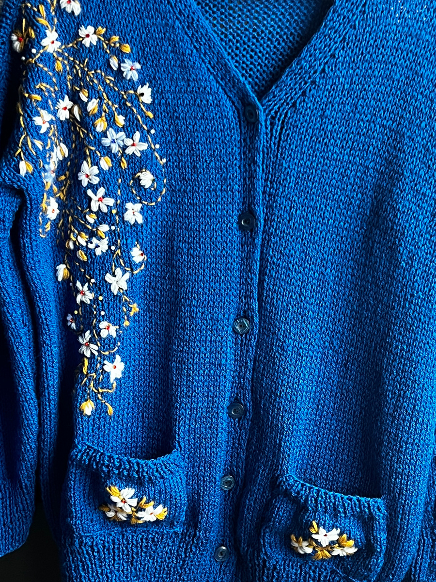 Добрый день, всем любителям вязания на спицах и им сочувствующим ! Сегодня я весьма охотно показываю свою работу в виде вязаной кофточки- кардиганчика под ласковым названием "Весна" с простой цветочной вышивкой. Конечно, сейчас время моей любимой зимы с ее неожиданными ежедневными метелицами, заснеженными деревьями и дорожками, но нотки песенки о теплой весенней погоде с ее первоцветами уже слегка звучат в моей голове и отзываются приятной истомой в моем сердечке. Все это находит отражение в моих вязанках, с которыми мне интереснее и увлекательнее жить на позитиве. На днях у меня это выплеснулось в новую работу с весенним настроением. Как Вы видите, основное полотно этого изделия связано простой лицевой гладью без всяких заморочек. В нем присутствуют мягкие воздушные акриловые нити синего цвета от турецкого производителя . Вот так выглядит этикетка с одного синего моточка 100 граммовой пряжи, длина которого составляет 300 метров. К этим нитям для вышивки я использо
