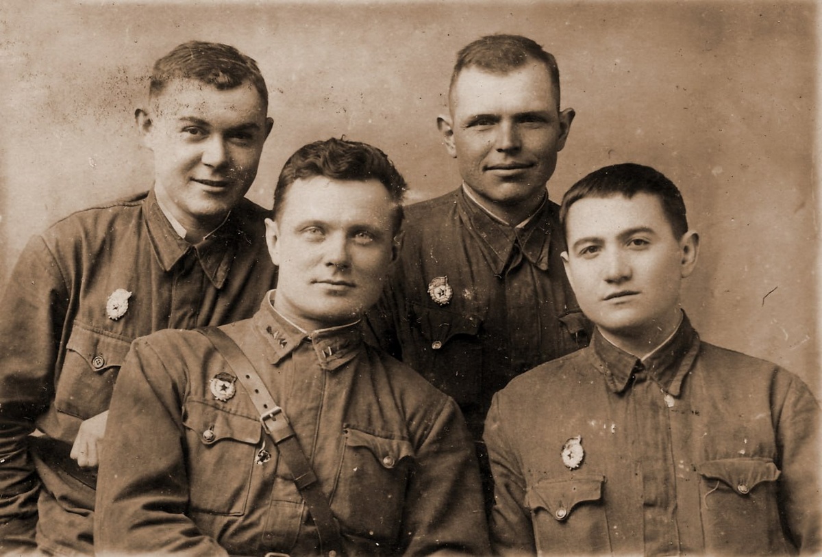 Военные в гимнастерках с полевыми петлицами образца 1941 года. На обороте - "На память любимой жене Вере от мужа Саши. 20.02.1943 г. Волчанск". Источник: отсканированная фотография из личной коллекции. #фото #гвардия #старшина #Красная_армия #РККА #ВОВ