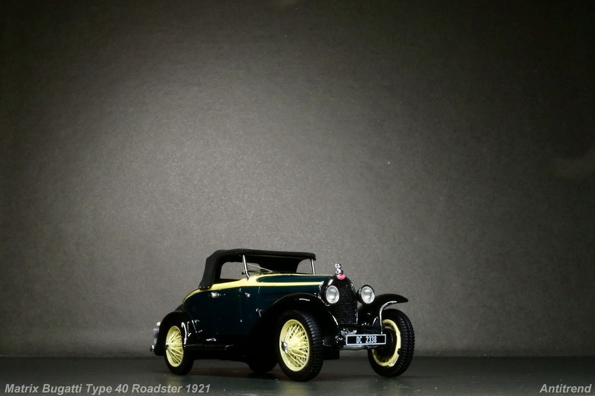 Полное название - Bugatti Type 40 Roadster 1921 Black/Yellow Производитель - Matrix Scale Models Каталожный номер - MX40205-022 Материал - смола Сделано в Китае Тираж - 408 экземпляров, номер экземпляра - 146. Название модели неверное - прототип датируется 1931 годом, точный индекс модели автомобиля Type 40A, а не Type 40, и даже цвет модели не черный, а темно-зеленый. В целом, модель очень хороша, высоко детализирована, отлично окрашена, не имеет дефектов сборки. Матрикс имел обыкновение "расплющивать" модели в ширину, из-за чего нарушался не только масштаб, но и пропорции. Не уверен, что эта модель правильна в пропорциях, не замерял, но визуально она не производит впечатления расширенной, что обычно заметно при виде спереди. Качество моделирования мне в этом случае очень нравится. Отличные спицованные колеса, тончайшие травленые элементы - дворники, детали за тентом, - запор запаски, выхлопная труба - все выполнено очень тонко и достоверно. Это же относится к светотехнике, интерье