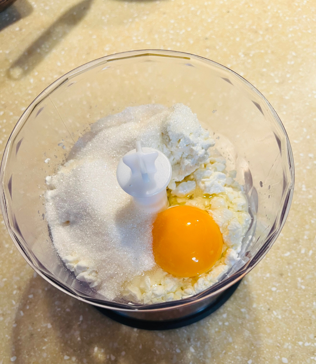 Творог с яйцом и сахаром разбила в блендере до мягкости
