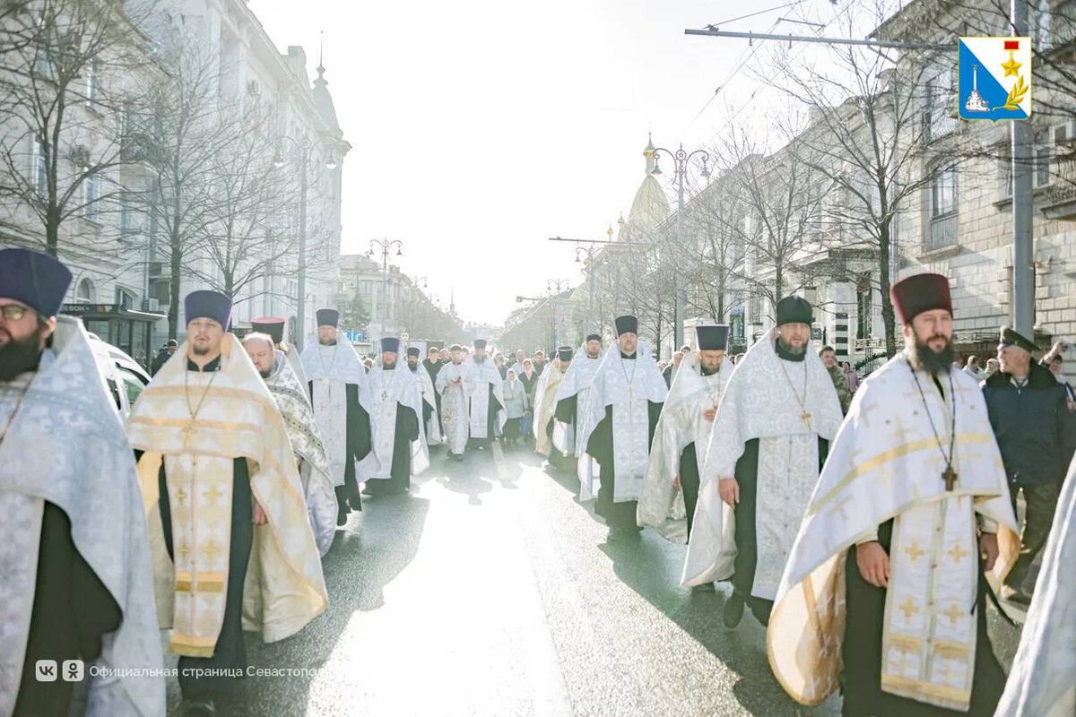 Началось молитвенное шествие от Покровского собора на Большой Морской и завершилось на площади Нахимова где благочинный центрального округа протоиерей Сергий Халюта отслужил молебен. На связи в MAX