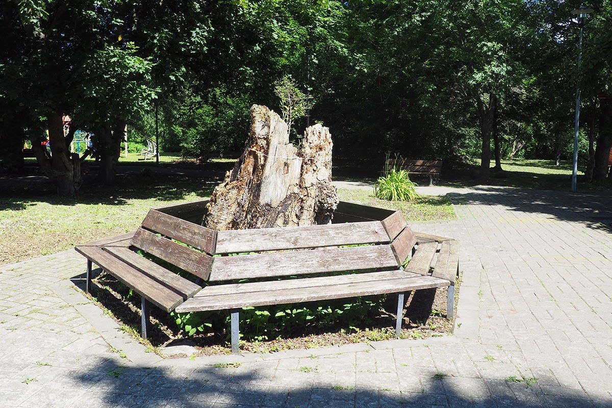 Это то, что осталось от Дуба мира, посаженного в Фишхаузене в 1871 году в честь окончания Франко-прусской войны, приведшей к созданию Германской империи. Дуб эта империя пережила почти сто лет, но не выдержала урагана 2012-го года. Сейчас имеет бледный вид. Недалеко от него стоит Дерево войны, созданное из касок, оружия и прочив армейских предметов. Всё это называется Сквер памяти.