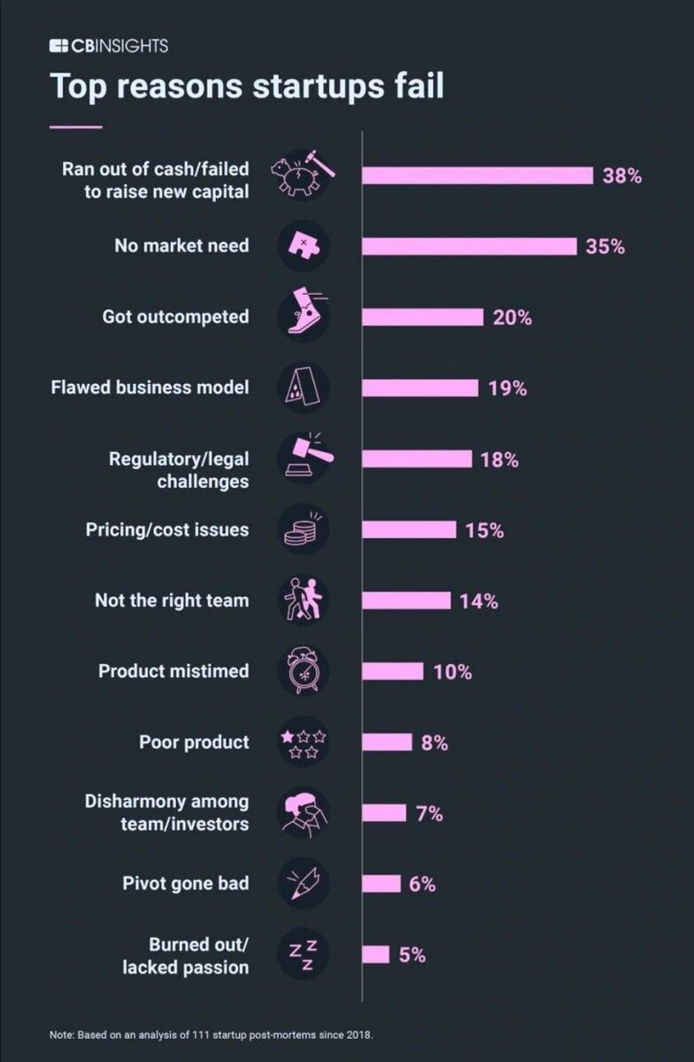 Чтобы ответить на этот вопрос, изучим, почему стартапы умирают. Сегодня в рубрике «Картинка выходного дня» рассмотрим список самых распространённых причин, по которым стартапы закрываются. 1️⃣ Обратим внимание на первую причину в списке. Стартапы закрываются потому, что у них заканчиваются деньги. Если вы делаете стартап, убедитесь, что вам хватит денег до момента выхода на полную самоокупаемость. Понимаю, что многие основатели улыбнулись (а предприниматели «старой школы» сделали facepalm), когда прочитали предыдущее предложение, ибо молодые стартаперы рассчитывают на следующий раунд или раунды (а предприниматели «старой школы» — на себя). В таком случае внесём уточнение. Нужно заранее расписать раунды и договориться о том, при выполнении каких (конкретных и измеримых) показателей стартап получит следующие деньги и не забывать про главную цель любой компании — стать прибыльной или продаться стратегу. А также не забывать о том, что по самым разным причинам следующего раунда может не быт