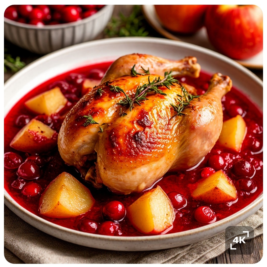 Это блюдо сочетает в себе нежность куриного мяса, сладость запечённых яблок и груш и яркую кислинку клюквенного соуса. Оно прекрасно подойдёт для семейного ужина или праздничного стола.