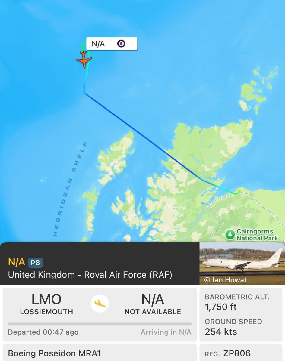 Базовый патрульный самолет Boeing Poseidon MRA1 Королевских ВВС Англии в настоящее время обеспечивает захват танкера Marinera, находящегося к югу от Фарерских островов