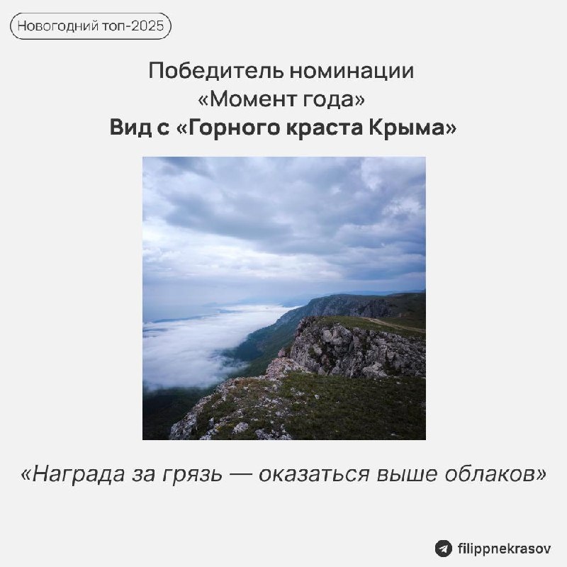 "! Тут было из чего выбирать - год выдался насыщенным до краёв. Но в сердце до сих пор спорят два крымских пейзажа. И победитель выходит по ощущениям - тот самый пятый ходовой день, когда мы забрались на тысячу метров и оказались выше облаков! Это было дико, нереально и до мурашек красиво. А ещё - справедливо. Учитывая, что забирались туда по грязи, которая нещадно забивала все зазоры, было чувство, будто эту панораму мы действительно заслужили. Почему именно этот момент? 1. Награда за усилия - когда красивое не просто "дано", а заслужено грязью и потом. 2. Шок от масштаба - оказаться над облаками, когда ещё пару часов назад карабкались по размокшей земле. Ближайшие претенденты: 1. Невероятная Лисья бухта - за ту самую, почти инопланетную, красоту и умиротворение. 2. Мыс Немецкий - момент, когда понимаешь, что доехал до той самой точки на карте, где заканчивается земля. P.S. Какой момент 2025 года вы до сих пор прокручиваете в голове?