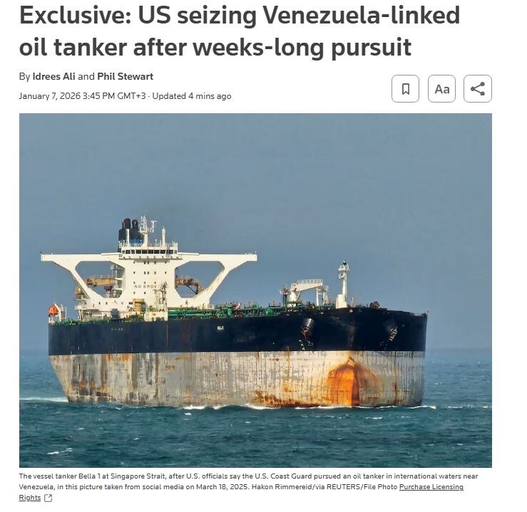 AQSH Rossiya bayrog‘i ostida harakatlanayotgan, ilgari “Bella-1” nomi bilan tanilgan Marinera tankerini qo‘lga olish bo‘yicha operatsiya boshladi.