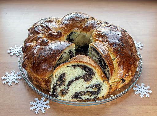 Сдобный дрожжевой пирог с маком и изюмом. Приготовить маковую начинку. Промыть мак водой, откинуть на сито, слить воду. Залить мак холодной водой так, чтобы уровень воды был на два пальца (3-3,5 см) выше уровня мака. Довести до кипения и кипятить на среднем огне, пока не выкипит вся вода (примерно 45 минут). Когда вода выкипит, снять с огня и смешать мак с сахаром. Пробить смесь погружным блендером. Добавить яичный белок к маку (желток оставить для смазки венка) и немного взбить смесь погружным блендером. Приготовить опару. Это можно сделать, пока готовится маковая начинка. Молоко подогреть, добавить чайную ложку сахара. Раскрошить дрожжи и размешать их в теплом молоке. Затем добавить 4-5 столовых ложек муки (из общего количества) и замесить жидкое тесто (опару). Опару накрыть пленкой или полотенцем и поставить в теплое место на полчаса. Смешать венчиком 2 яйца с сахаром, солью, ванильным сахаром и размягченным сливочным маслом. Добавить эту смесь в подошедшую опару. Перемешать и пост