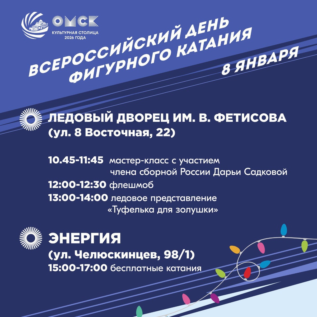 В День фигурного катания на городских катках и в районах области будут организованы бесплатные катания. В 2025 году омский День фигурного катания был признан лучшим в стране, масштабно отметить событие планируют и в 2026 году. Дарья Салковп выступит на главной площадке праздника – катке «Вектор» на Зимнем Любинском, а также проведет мастер-классы для профессиональных спортсменов и любителей. Программа с ней будет организована в ледовом дворце спорта им. Вячеслава Фетисова. Праздничная программа запланирована и на катке у СКК им. Блинова и в парке «Вокруг света». В этот день для омичей организуют бесплатные сеансы катания с 15:00 до 17:00 в районах области и на открытых катках Омска: у ФОКа «Авангард», спорткомплексов «Юность» и «Красная звезда», ледовых дворцов имени Киселева и Фетисова. Подробная программа указана в карточках. 💙Мы в МАХ