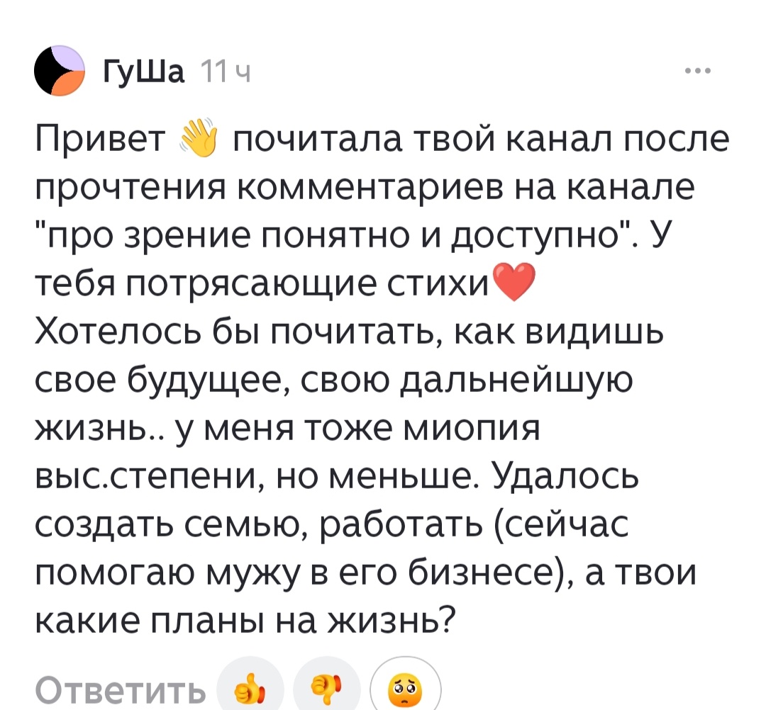 Закончила 11 классов а так сейчас я не работаю и не учусь во первых из -за зрения 👁️ , во вторых потому что у меня ещё много других проблем со здоровья и я эти несколько лет по больницам .