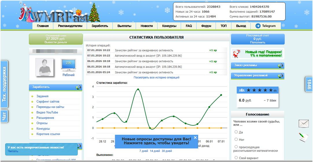 Тип заработка: Заработок реализован на сёрфинге сайтов, опросов, просмотре видео и других методов. На текущий момент сайт работает более 11 лет. Адрес сайта: http://wmrfast.com/ Пополнение: Отсутствует. Пополнение присутствует только для рекламного счёта. Описание: Данный проект позиционирует заработок без вложений. В процессе заработка вам начисляются реальные деньги, которые вы можете впоследствии вывести их на свои счета. На сёрфинге сайтов и при переходах на сайты за сутки у меня получалось заработать около 4 рублей. Максимальный заработок получается при выполнении заданий и прохождении опросов. С опросами мне не очень повезло, первый опрос прошёл нормально, а остальные мне отказали в виду их отсутствия для моей категории. На сайте имеется начисление рейтинга за различные действия на сайте. За ежедневное посещение сайта +1 бал рейтинга. Также рейтинг начисляется и за другие действия. В зависимости от суммы рейтинга вам присваивается соответствующая должность, которая напрямую зави
