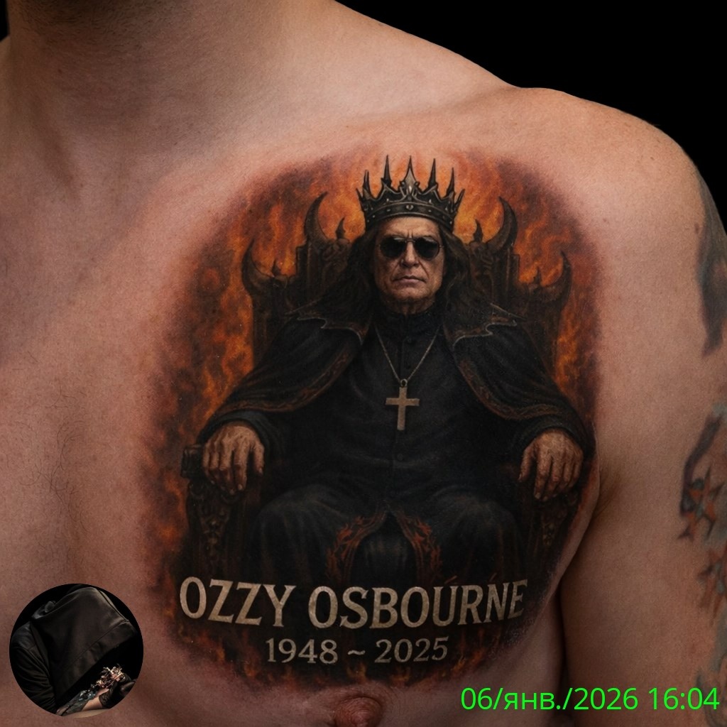 На этом фото изображена впечатляющая татуировка, посвящённая легендарному рок-музыканту Оззи Осборну. На ней изображён сам Оззи, сидящий на троне, окружённый огненным фоном, что символизирует его яркий и мощный образ на сцене. На груди музыканта красуется корона, подчёркивающая его статус «Короля рок-н-ролла».