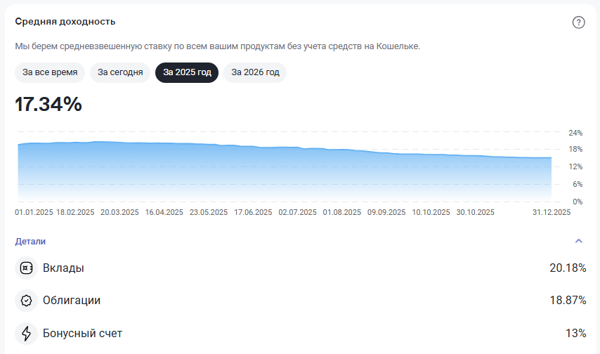 Закончился 2025 год, по сравнению с прошлым годом инвестиции принесли существенный доход. Существенный доход получен на ФинУслугах за счет банковских депозитов, правда доходность снизилась с 21,76% в 2024 году до 20,18% в 2025 году. И со снижением ключевой ставки эта доходность буде снижаться. В конце года перешли от шестимесячных депозитов на трехмесячные, так как по ним годовая доходность выше. Печальной новостью стало превышение дохода по депозитам над необлагаемый суммой, по этому с разницы придется платить налог. По сравнению с прошлым годом прибыль (за вычетом НДФЛ) выросла с 10% до 18,5%. Основную часть прибыли составил купонный доход по облигациям - 14,7%, так как рынок акций весь год находился во флэте. В течение года наращивали депозит на брокерском счету за счет прибыли от банковских депозитов. В итоге к декабрю депозит вырос в пять с половиной раза. В декабре 2025 года продолжали ребалансировку портфеля облигаций, продавая флоаторы с не высокой ставкой купонного дохода и