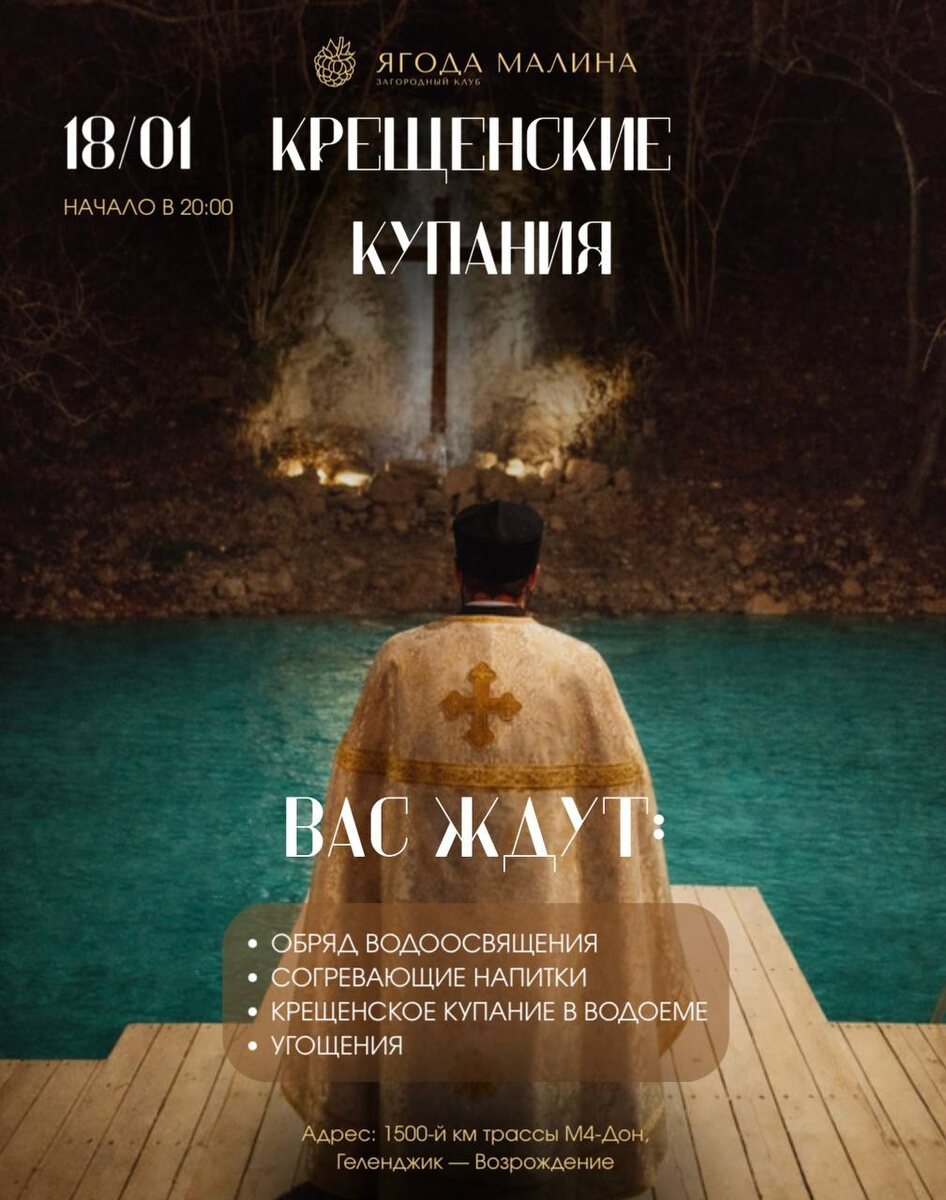 Дорогие гости, ждем вас в Крещенскую ночь с 18 на 19 января Начало в 20:00 Вас ждут: • Обряд водоосвящения • Согревающие напитки • Купание в водоеме • Угощения Приезжайте к нам за любимыми традициями и оздоровлением Подробнее по телефону: +7 (928) 435-00-05