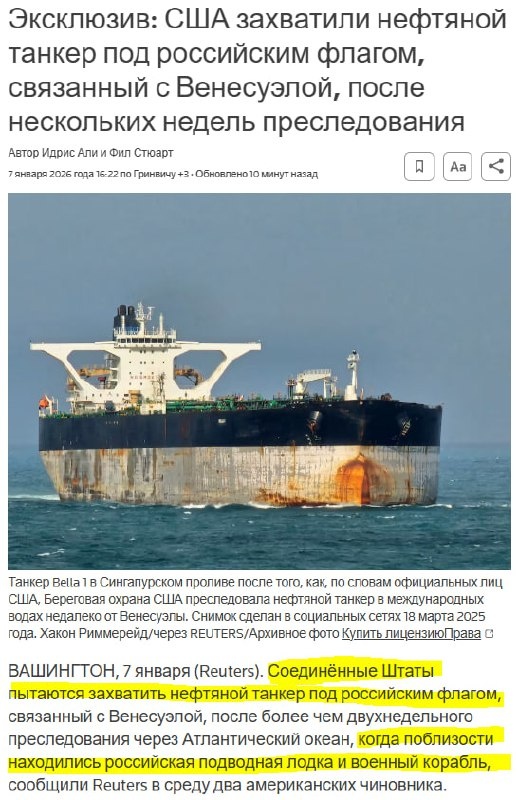 Заявления Reuters по поводу того, что наш военный корабль находился вблизи захваченного американцами танкера и ничего не делал - вымысел
