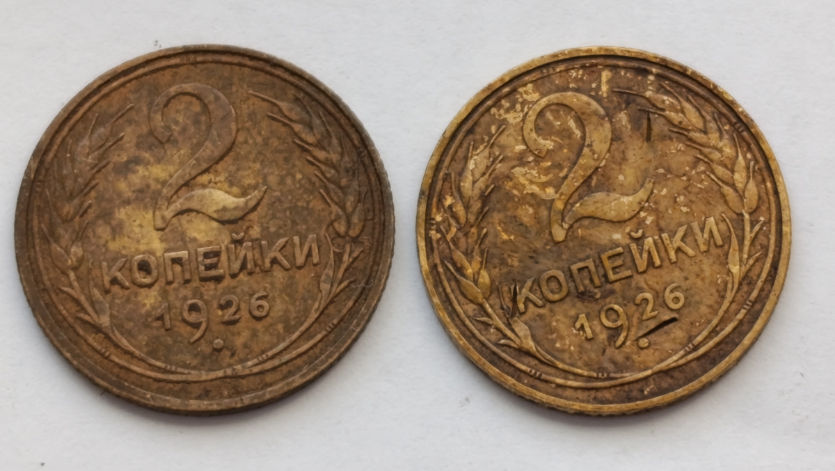 Ничего себе! А ведь уже 100 лет прошло с того времени, как в СССР монеты небольшого номинала начали чеканиться по новым стандартам, когда вес монет в граммах соответствовал их номиналу. А еще в качестве металла изготовления для монет от 1 до 5 копеек стала выступать бронза. И вот такие 2 монетки 1926 года мне бы хотелось почистить: Чищу стандартным образом, который много раз описывал на страницах канала. В результате получилось вот так: Кто, зачем и как решил испортить одну монетку методом оставления на ней "углублений" - можно только догадываться. Но зато левая монетка после чистки выглядит вполне красиво. Её можно положить и в альбом, если такого года еще нет. Я думаю, левую монету 2 копейки 1926 года вполне можно оценивать по ценнику. А по ценнику она выходит примерно ... 100 рублей. Вот и получается, монета, которой исполнилось ровно 100 лет, стоит совсем ничего по современным деньгам. Но столько стоят монеты массовых тиражей. Если посмотреть на эти монеты очень внимательно,