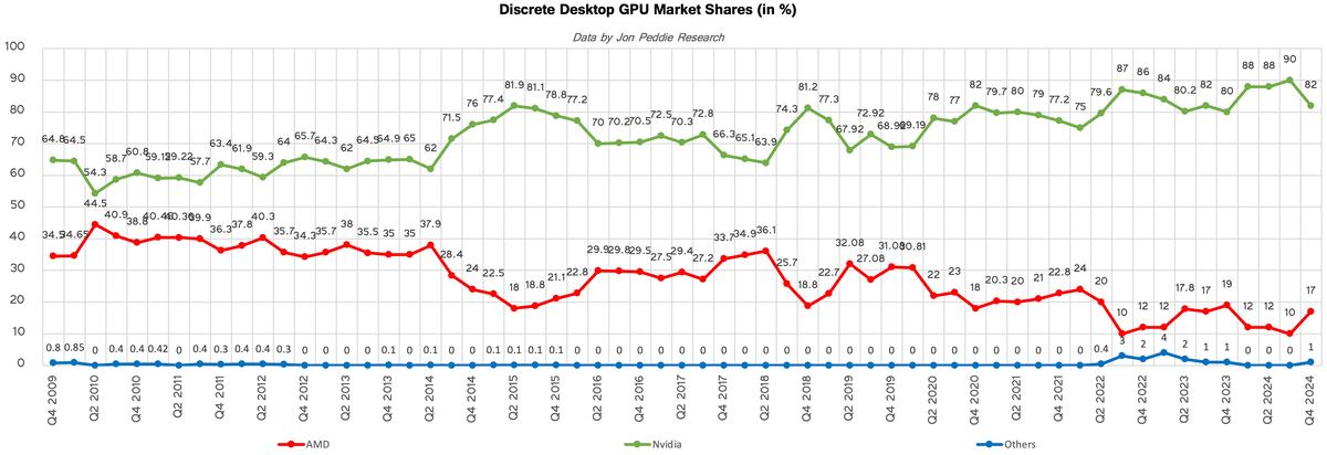 Может показаться, что на рынке видеокарт два игрока - Nvidia и AMD. Но если мы посмотрим на карту продаж, то увидим интересную картину: "Зеленые" обеспечивают видеокартами почти 90% пользователей, пока AMD - просто плетутся за ними, и этому есть несколько причин. Вечером выйдет более подробная статья с объяснением причин и хронологии, сейчас нам интересен только один вопрос - почему AMD не покупают? Ведь высокий и низкий спрос не формируется из "ниоткуда", а является, по сути, "голосованием кошельком". Это - вопрос с подвохом. Условимся, что говорим мы только про дискретную графику - встроенные AMD 880M и 890M сейчас буквально уничтожают решения от Intel, тогда как у Nvidia встроенной графики нет вовсе. Что у них есть - так это бесконечная база технологий и неограниченный бюджет. AMD может лишь реагировать на новые технологии, которые вводит Nvidia - так было с трассировкой лучей, DLSS, и даже генерацией кадров. Несмотря на дружелюбную политику в отношении пользователей (FSR - аналог D