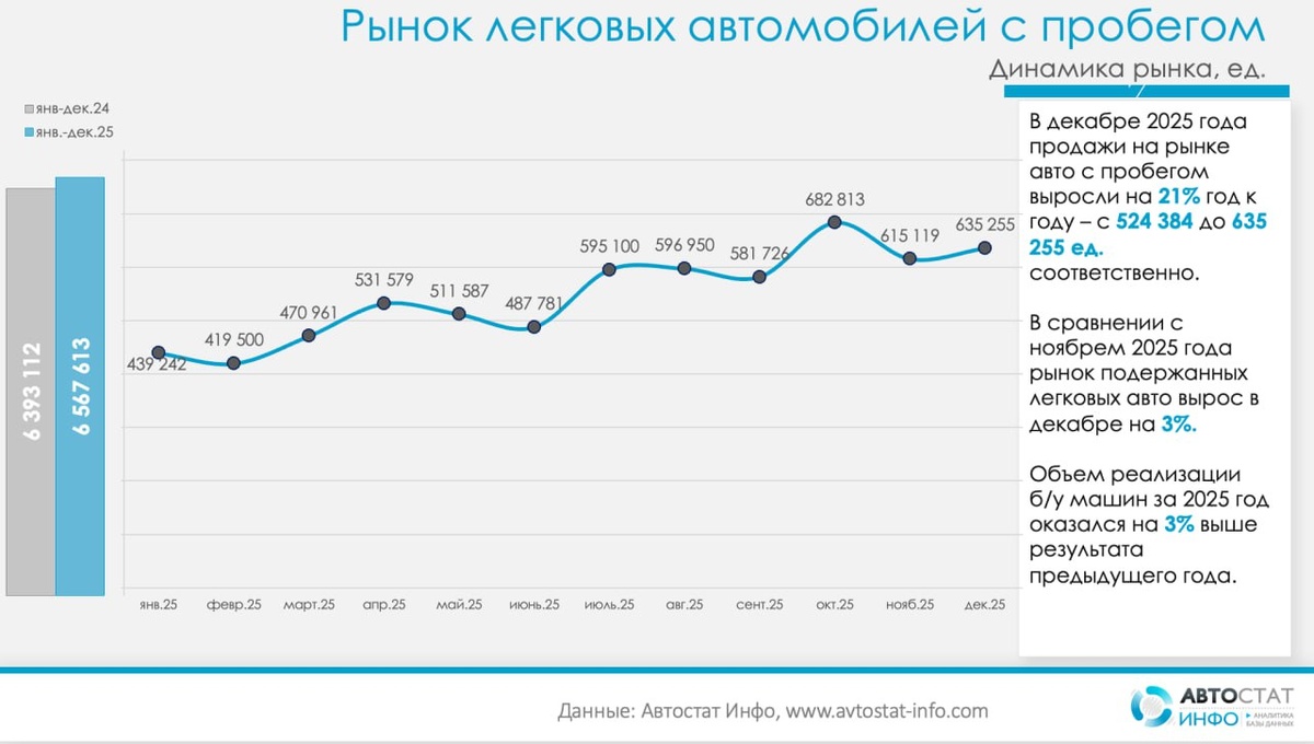 % Рынок легковых автомобилей с пробегом завершил 2025 год в плюсе и фактически стал «подушкой безопасности» для всего авторынка. По данным «Автостат Инфо», в декабре было оформлено 635,3 тыс. сделок против 524,4 тыс. год назад, а за весь год объем рынка достиг 6,57 млн автомобилей против 6,39 млн в 2024-м. Декабрь показал классическую годовую развязку: плюс 21% к декабрю 2024 года и еще плюс 3% к ноябрю. Спрос не выглядит ажиотажным, это скорее спокойная донастройка парка: часть покупателей, не дождавшись комфортных условий по новым машинам, закрывает вопрос на вторичке. В результате, при падающей «первичке», вторичный рынок прибавляет по итогам года 3% и закрепляется выше отметки 6,5 млн сделок с авто с пробегом. По брендам никаких революционных изменений не произошло, но расстановка сил стала еще нагляднее. Lada остается абсолютным номером один: в декабре перерегистрации выросли на 10% (до 149,3 тыс. машин), а за год – до 1,62 млн (+2%). На втором и третьем местах Toyota и KIA: я