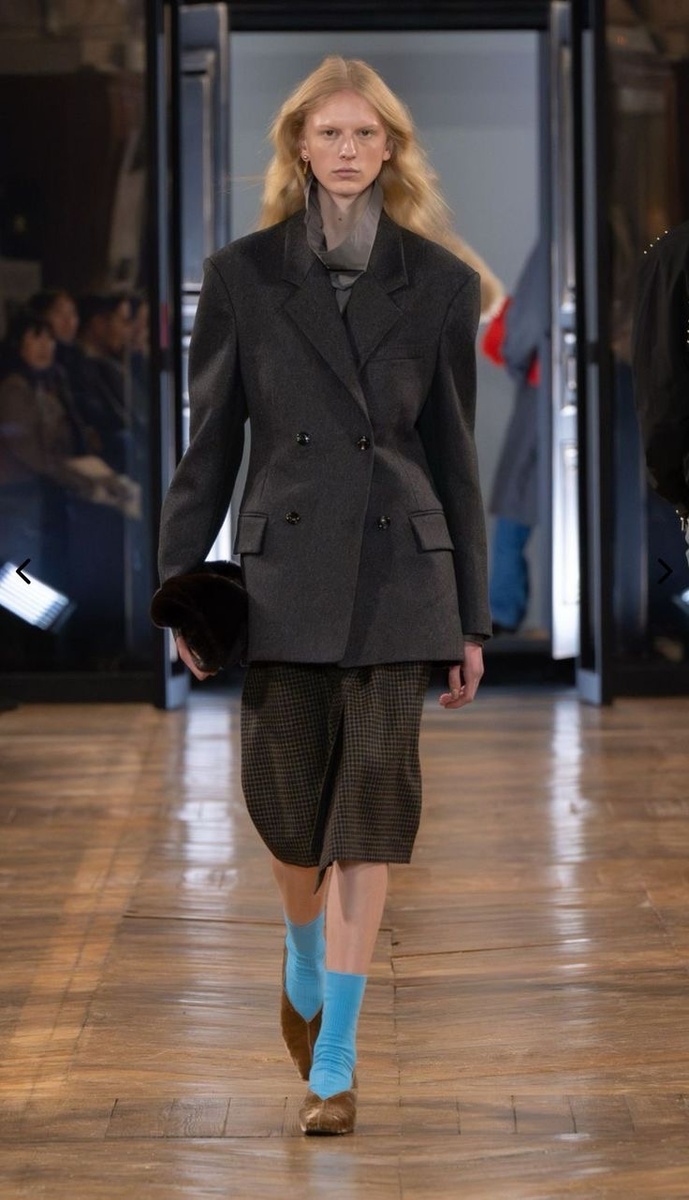 - Как это выглядит: объемный, структурный верх (массивный свитер, пиджак с подплечниками) + узкий, точный низ (леггинсы, тонкие брюки-сигареты, колготки).