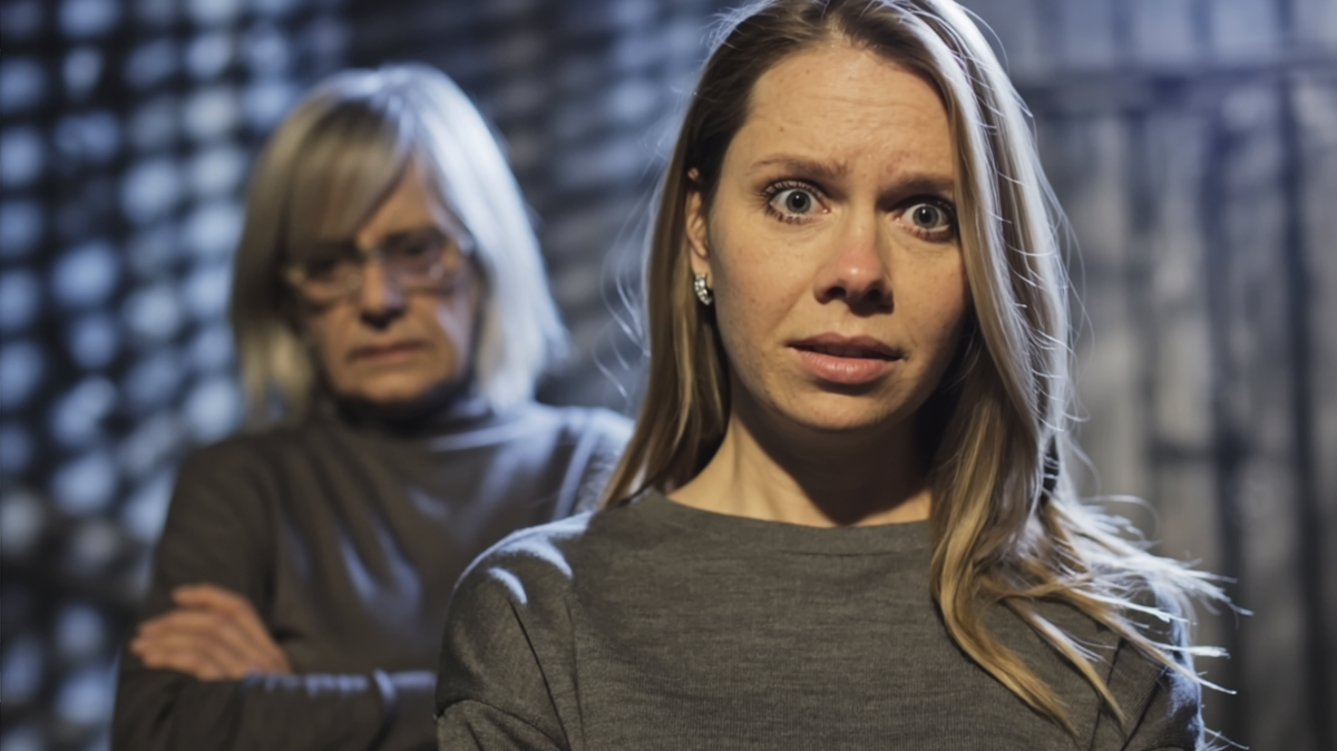 Анна смотрит на дверь долго. Потом подходит, кладёт руку на замок и вдруг поворачивает ключ. Один. Второй оборот. Слышно, как опускается засов.