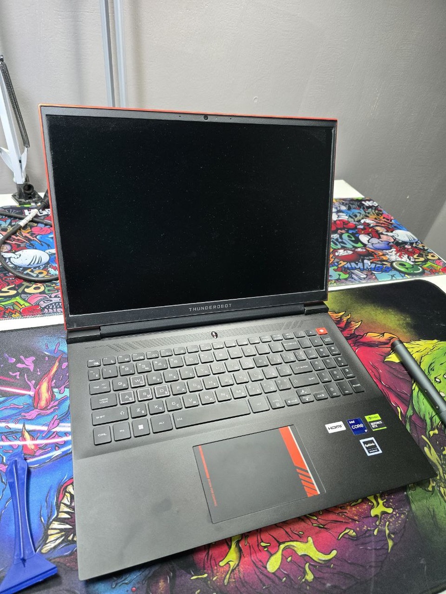 На обслуживании были очень интересный ноутбук в необычном оранжевом цвете на процессоре Core i9 и RTX 4080 и старенький ПК Lenovo.