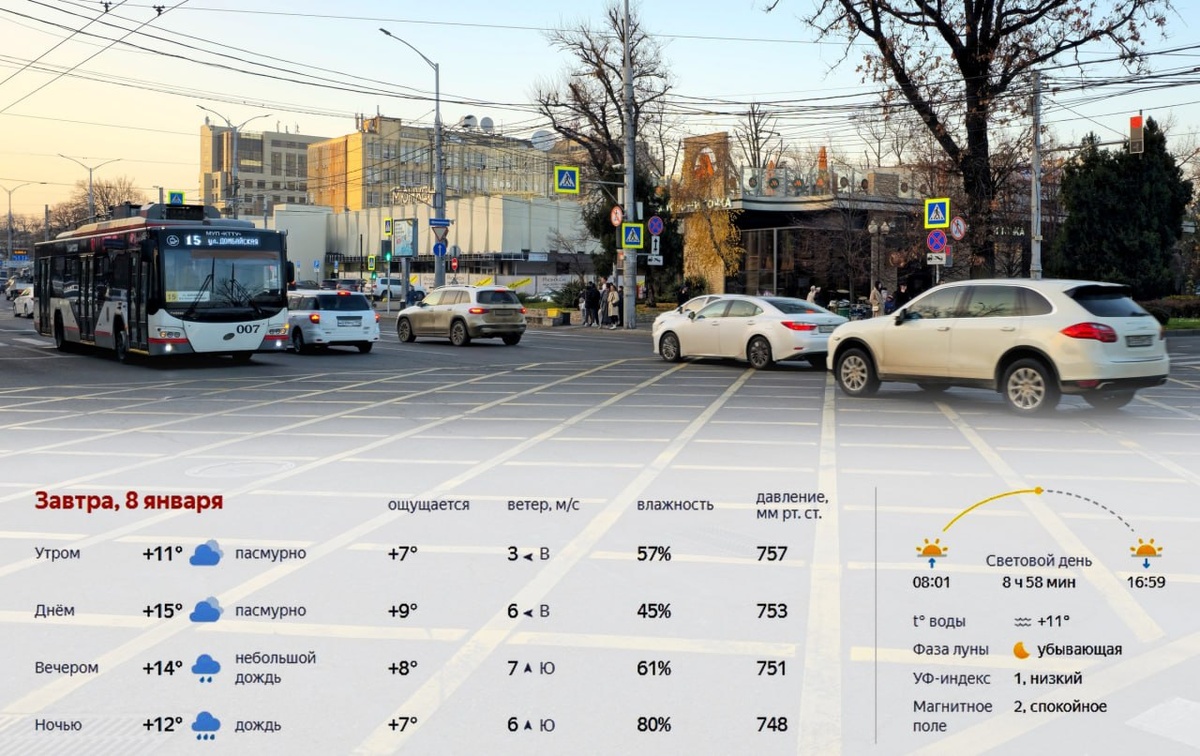 Завтра, 8 января, в Краснодаре ожидается влажная и неустойчивая погода. Утром около +11° при пасмурном небе и восточном ветре. Днём потеплеет до +15°, но сохранится облачность и усилится ветер. Вечером начнётся небольшой дождь и температура снизится до +14°, ночью дождливая погода продолжится, похолодает до +12°. Световой день продлится 8 часов 58 минут, восход в 08:01, закат в 16:59. Температура воды +11°, УФ-индекс низкий, магнитное поле спокойное. Подробнее: https://краснодарскийкрай.рф/news/prognoz-pogody-v-krasnodare-na-8-janvarja-2026-goda.html Прогноз погоды на неделю: https://краснодарскийкрай.рф/pages/weather-forecast.html #погода #прогнозпогоды #температура #осадки #ветер #климат #метеопрогноз #метеосводка #краснодар #краснодарскийкрай #krasnodarregion