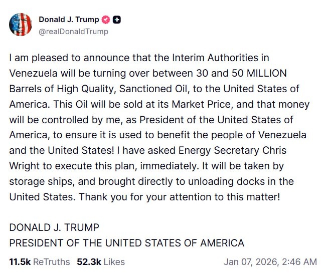 США требуют от Венесуэлы эксклюзивного нефтяного партнёрства. Танкеры с нефтью должны идти только в США, что проконтролирует американский флот, блокирующий порты Венесуэлы. Дональд Трамп написал: «С радостью сообщаю, что временные власти Венесуэлы передадут Соединенным Штатам Америки от 30 до 50 миллионов баррелей высококачественной, разрешенной к использованию нефти. Эта нефть будет продаваться по рыночной цене, и я, как президент Соединенных Штатов Америки, буду контролировать эти средства, чтобы гарантировать, что они будут использованы на благо народа Венесуэлы и Соединенных Штатов! Я поручил министру энергетики Крису Райту немедленно приступить к реализации этого плана. Нефть будет доставлена на судах-хранилищах непосредственно на разгрузочные причалы в Соединенных Штатах. Благодарю вас за внимание к этому вопросу!»