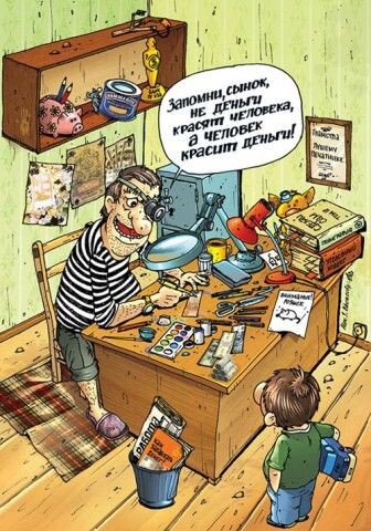 Муж-фальшивомонетчик хвалит жену: – Умница, сегодня ты истратила еще 10 тысяч рублей…