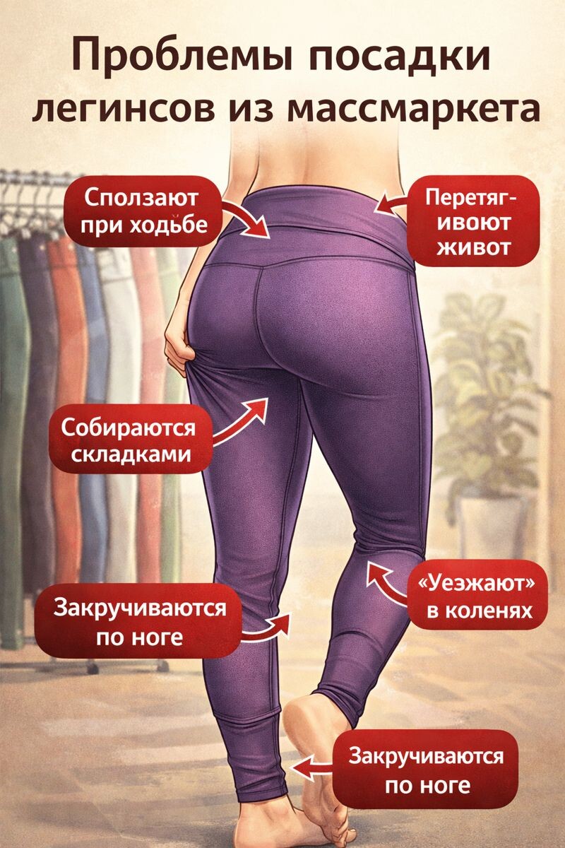 И даже не с качеством ткани. Причина — в конструкции. В массовом производстве легинсы создаются по усреднённым выкройкам.