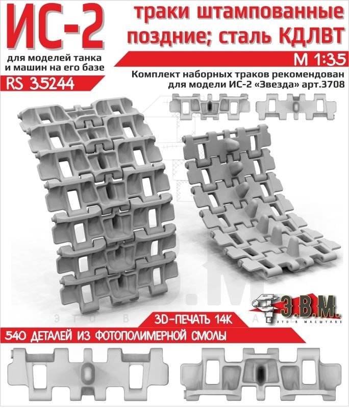 В.М. выпустили траки штампованные поздние для ИС-2 , сталь КДЛВТ. 1/35 масштаб. Цена - 1200₽. В наборе по 120 левых и правых траков и 300 пальцев для их соединения. Это в полтора разе больше, чем нужно для сборки полноценной ленты, так что Вы можете не опасаться что-то испортить. Плюс останется запас, который можно разместить на броне. Траки с высокой степенью детализации передают все нюансы конструкции, имеют полый гребень, гарантированно подходят к ведущим колесам из набора "Звезды", надежно и просто собираются в подвижную гусеницу, достаточно прочную, способную выдерживать нагрузку в несколько кг. Изготовлены из фотополимерной смолы, печать 14К.