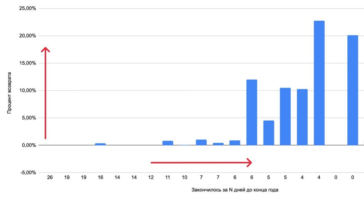 ΠΠ Π² ΠΏΡΠΈΠ±ΡΠ»ΠΈ, ΠΏΠΎΠΊΡΠΏΠ°ΡΠ΅Π»Ρ Π² ΠΏΡΠΈΠ±ΡΠ»ΠΈ, ΡΠ΅Π»Π»Π΅Ρ ΡΠ°ΠΌ ΠΆΠ΅) ΠΠΎ Π½ΠΈΠΆΠ½Π΅ΠΉ ΠΎΡΠΈ β Π·Π° ΡΠΊΠΎΠ»ΡΠΊΠΎ Π΄Π½Π΅ΠΉ Π΄ΠΎ ΠΠ Π·Π°ΠΊΠΎΠ½ΡΠΈΠ»ΡΡ ΡΡΠΎΠΊ. ΠΠΎ Π»Π΅Π²ΠΎΠΉ ΠΎΡΠΈ β ΠΏΡΠΎΡΠ΅Π½Ρ Π²ΠΎΠ·Π²ΡΠ°ΡΠ° ΠΎΡ Π²ΡΠ΅ΠΉ ΠΏΠ°ΡΡΠΈΠΈ. ΠΠ°ΡΠ° 6/01 β ΡΠΎ Π΅ΡΡΡ ΡΡΠΎ Π΅ΡΠ΅ Π½Π΅ ΠΊΠΎΠ½Π΅Ρ. Π’ΡΡ Π²ΡΠ΅ ΠΏΠΎΠ½ΡΡΠ½ΠΎ, ΡΠ΅ΠΌ Π±Π»ΠΈΠΆΠ΅ ΠΊ ΠΠ ΡΠ΅ΠΌ Π±ΠΎΠ»ΡΡΠ΅ Π²ΠΎΠ·Π²ΡΠ°ΡΠΎΠ². ΠΠ΅ΠΊΠΎΡΠΎΡΡΠ΅ Π‘ΠΠ£ ΡΠΆΠ΅ Π½Π° 6/01 ΠΏΠΎΠ»ΡΡΠΈΠ»ΠΈ 20%+ Π²ΠΎΠ·Π²ΡΠ°ΡΠΎΠ² ΠΎΡ Π²ΡΠ΅ΠΉ ΠΏΠ°ΡΡΠΈΠΈ. Π’Π°ΠΊΠΈΠ΅ Π·Π°ΠΊΠΎΠ½ΡΠΈΠ»ΠΈΡΡ 26-27 ΡΠΈΡΠ»Π°. ΠΠΎΡΠΌΠΎΡΡΠΈΠΌ, ΡΡΠΎ Π±ΡΠ΄Π΅Ρ Π² Π±Π»ΠΈΠΆΠ°ΠΉΡΠΈΠΉ ΠΌΠ΅ΡΡΡ, ΠΎΠ±ΡΡΠ½ΠΎ ΠΏΡΠΈΠΌΠ΅ΡΠ½ΠΎ Π½Π° 30% Π²ΠΎΠ·Π²ΡΠ°ΡΠΎΠ² Π²ΡΠ΅ ΠΎΡΡΠ°Π½Π°Π²Π»ΠΈΠ²Π°Π΅ΡΡΡ, Π½ΠΎ ΡΡΡ Ρ Π½Π΅ Π²Π΅ΡΡ))