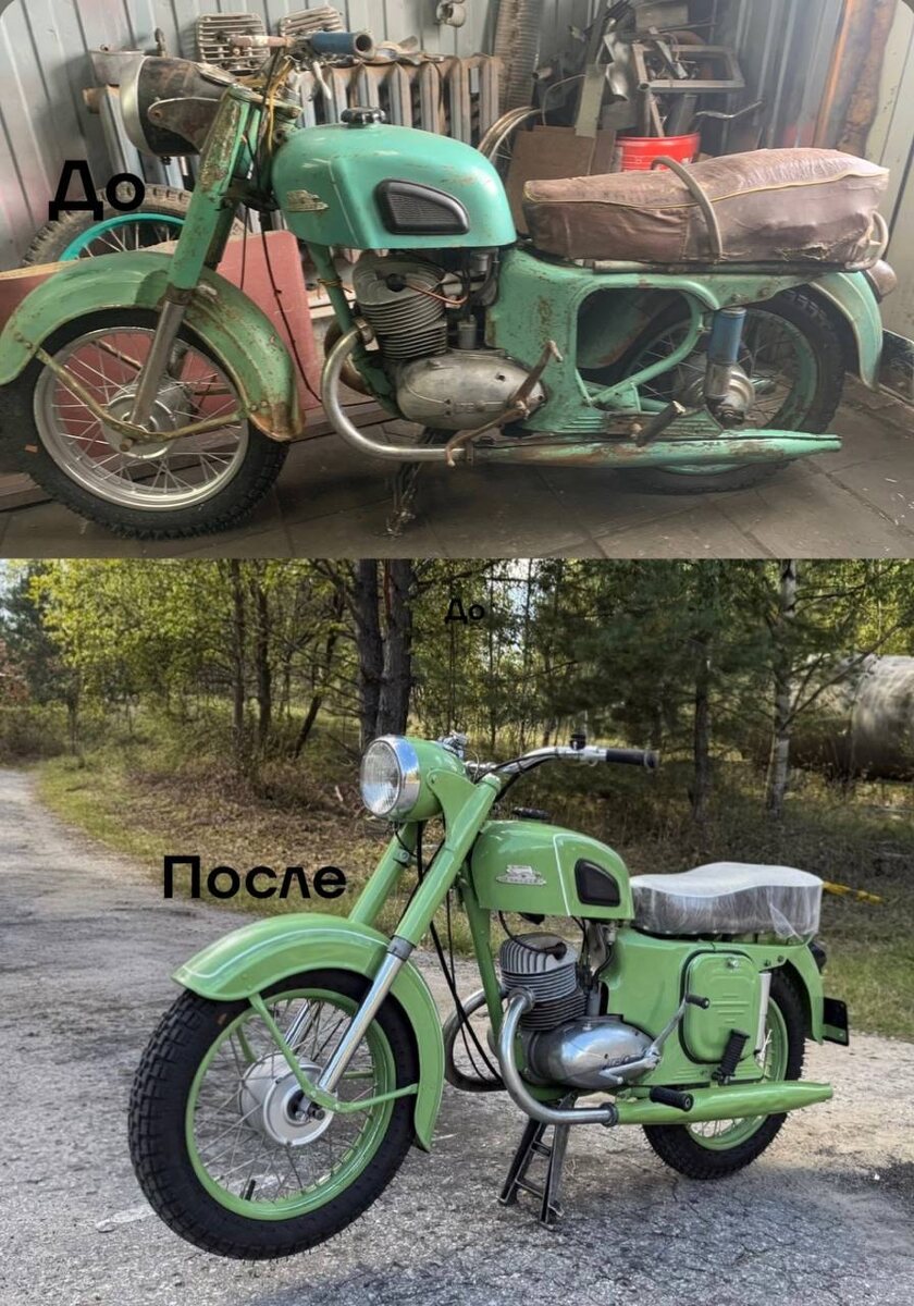 Мотоцикл семейный и имеет ментальную ценность.После эксплуатации очень, долгое время простоял в гараже.С виду он выглядел не сказать чтобы плохо.С заказчиком был выбран бюджет реставрации и принято решение восстанавливать мотоцикл без перехрома. При разборке мотоцикла выяснилось что мотоцикл был ударен вперед и изкривление рамы и внутренних направляющей вилки прибавило нам работы. Но не смотря на это нам удалось возродить бывалую харизму этого малокубового скакуна) После поездки на нем, убедился что в этих мотоциклах что то есть такое что заставляет вновь оседлать этот маленький но притегательный мотоцикл. Самое сложное на этом мотоцикле это было найти и "привести в чувство" глушители. Как вы видите на фото, то выхлоп нам не до конца удалось вывести. Хоть мотоцикл уже радует заказчика, то все еще актуален поиск выхлопа для этого мотоцикла. #мотореставрация #мотосевер #ковровец #мото
