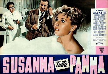 Сливочная Сюзанна / Susanna tutta panna / Susana, pura nata. Италия-Испания, 1957. Режиссер Стено. Сценаристы: Витторио Метц, Марчелло Маркези, Анхель Пажео. Актеры: Мариса Аллазио, Герман Кобос, Марио Каротенуто, Нино Манфреди и др. Комедия. Мелодрама. Премьера: 20.09.1957. Прокат в Италии: 1,9 млн. зрителей. Симпатичная миланская кондитерша Сюзанна (Мариса Аллазио) знает рецепт вкуснейшего торта, за которым охотятся конкуренты. В один прекрасный день она решает подарить торт своему ревнивому жениху… В годы выхода этой комедии в итальянский кинопрокат киновед Морандо Морандини (1924-2015) оценил ее низко: «Даже говорить об актерской игре не приходится: среди множества известных актеров и характерных актеров, приглашенных на эту неистовую и шумную карусель, каждый демонстрирует недостаток актерского мастерства» (Morandini, 1957). Уже в XXI веке Рафаэль Н. Хименес также не нашел в «Сливочной Сюзанне» существенных художественных достоинств, отметив, что здесь «разворачиваются отдельные с